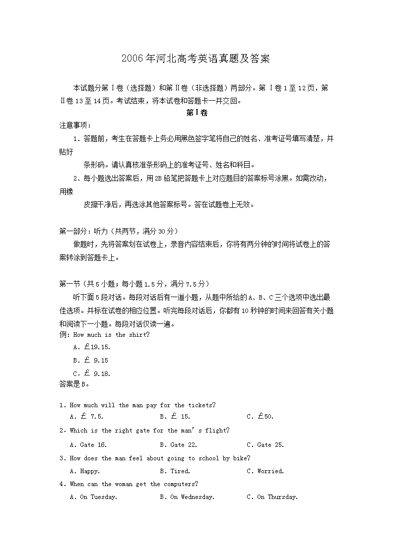 【文档名称】 2006年河北高考英语真题及答案(Word版).doc