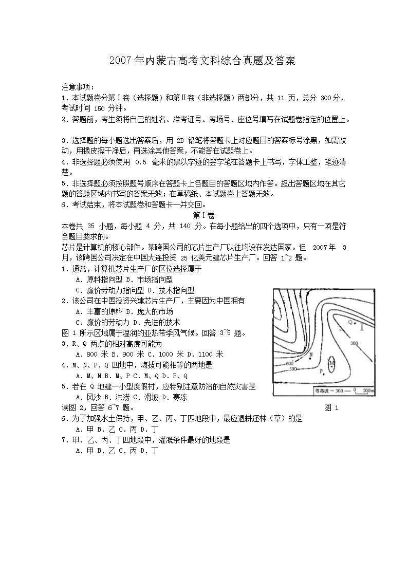 【文档预览】 无忧考网整理发布2007年内蒙古高考文科综合真题及答案(Word版),前五页预览如下: