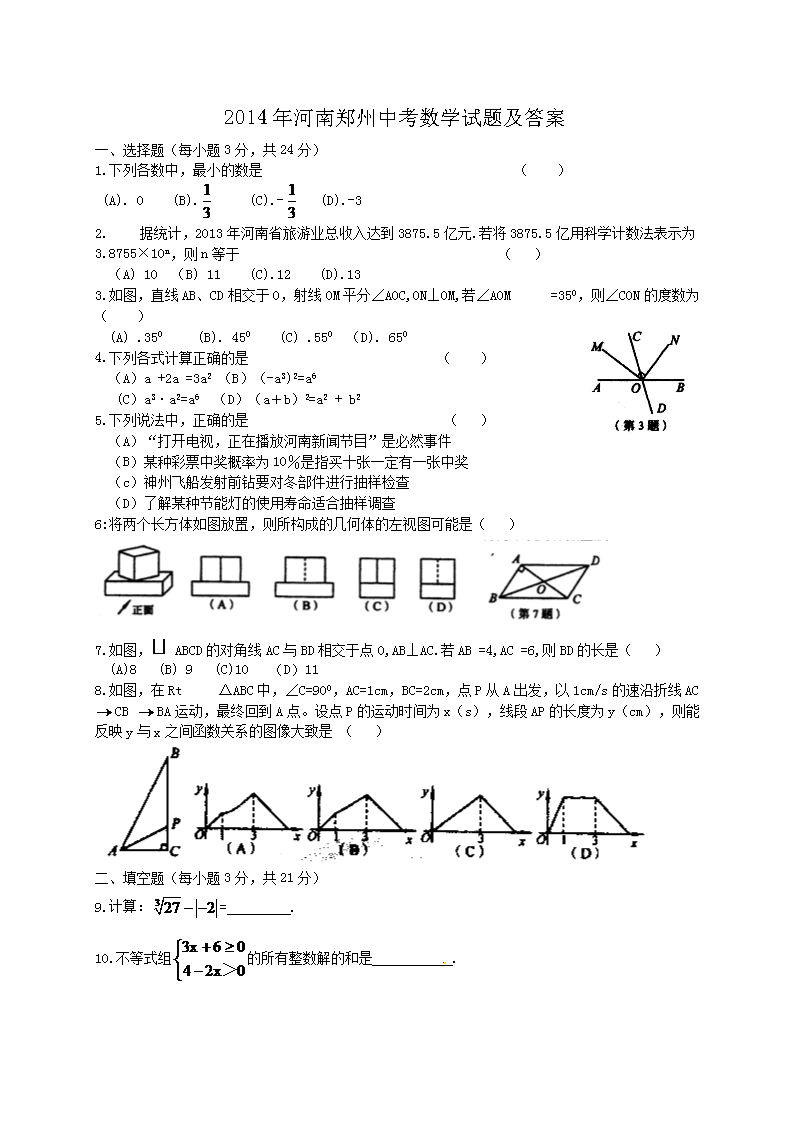 【文档名称】 2014年河南郑州中考数学试题及答案(Word版).doc