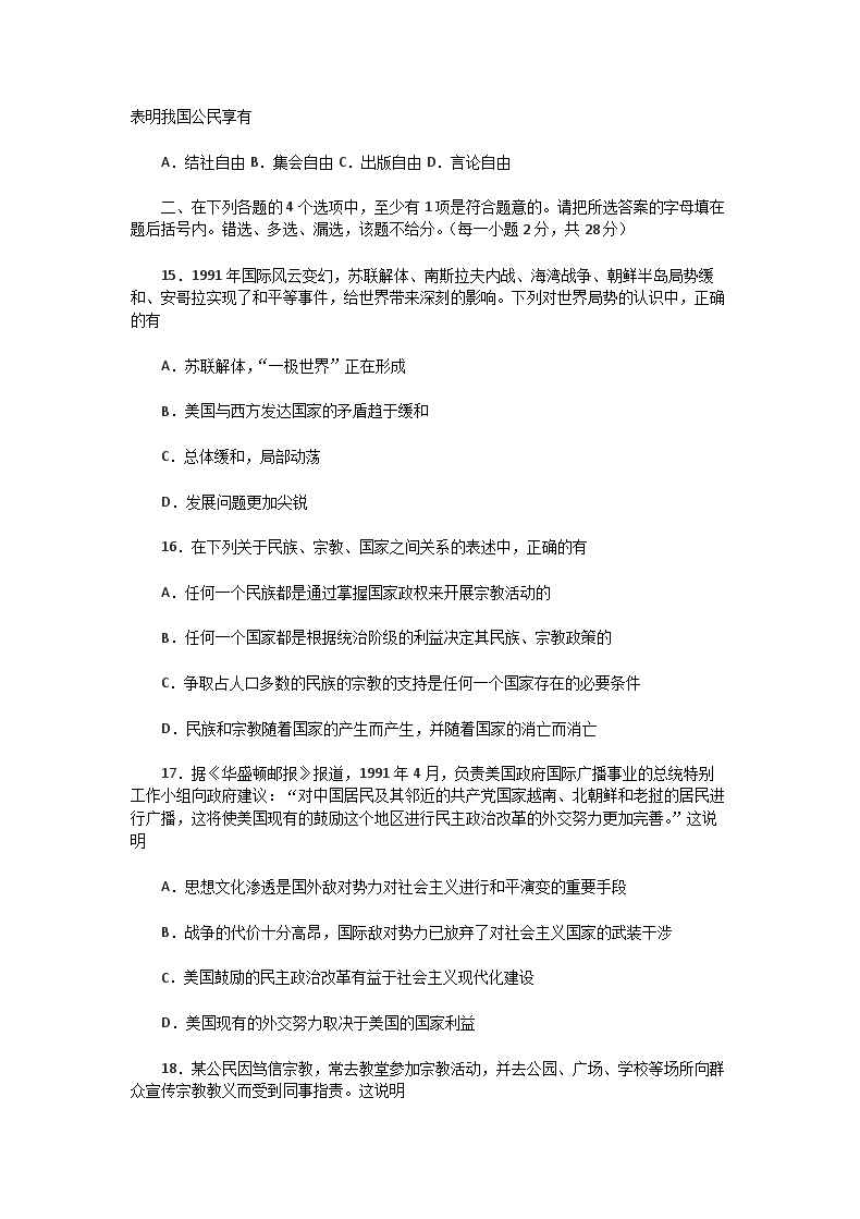 【文档预览】 无忧考网整理发布1992年江苏高考文科政治真题及答案(Word版),前五页预览如下: