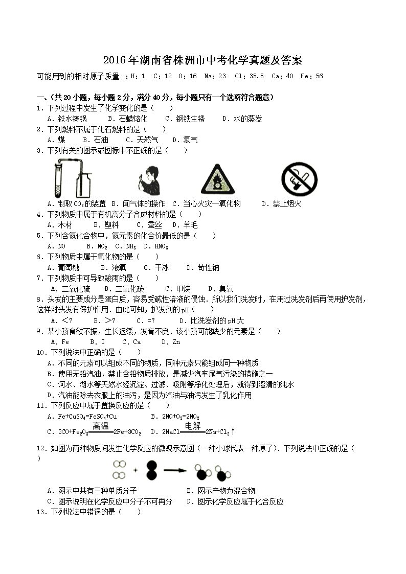 【文档名称】 2016年湖南省株洲市中考化学真题及答案(Word版).doc