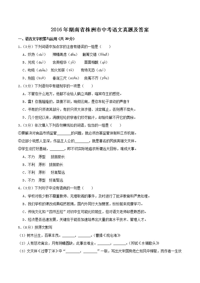 【文档名称】 2016年湖南省株洲市中考语文真题及答案(Word版).doc