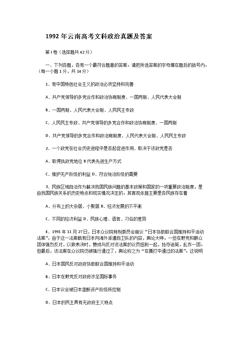 【文档名称】 1992年云南高考文科政治真题及答案(Word版).doc