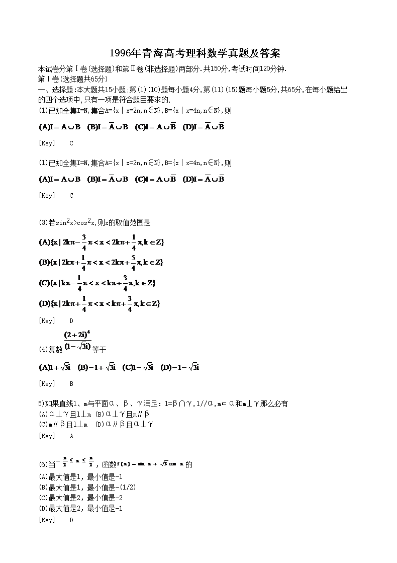 【文档预览】 无忧考网整理发布1996年青海高考理科数学真题及答案(Word版),前五页预览如下: