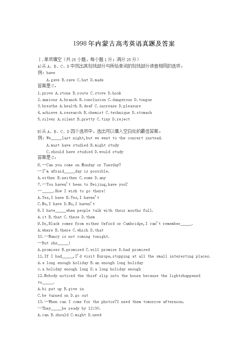 【文档预览】 无忧考网整理发布1998年内蒙古高考英语真题及答案(Word版),前五页预览如下: