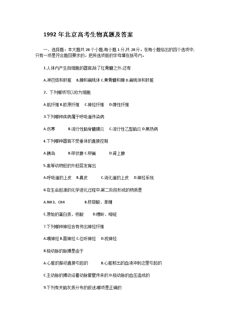 【文档名称】 1992年北京高考生物真题及答案(Word版).doc