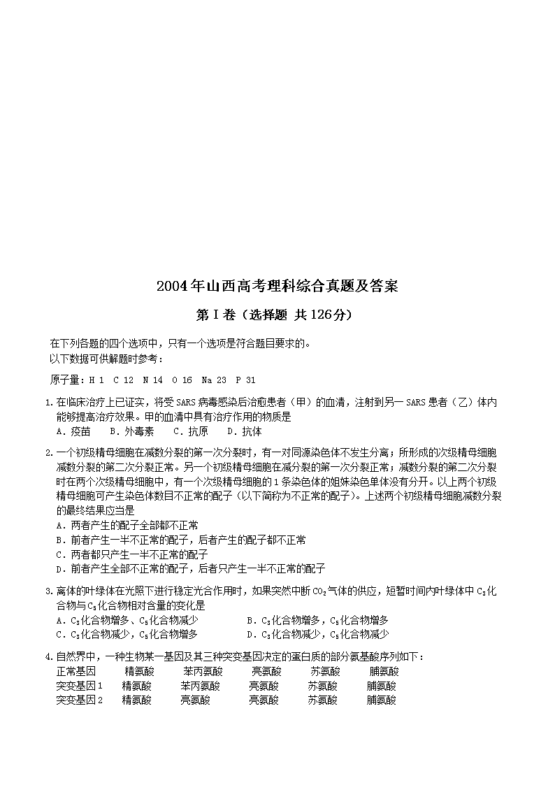 【文档名称】 2004年山西高考理科综合真题及答案(Word版).doc