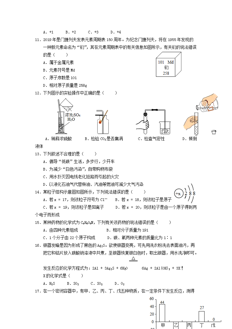 【文档名称】 2019年云南昆明中考化学真题及答案(Word版).doc