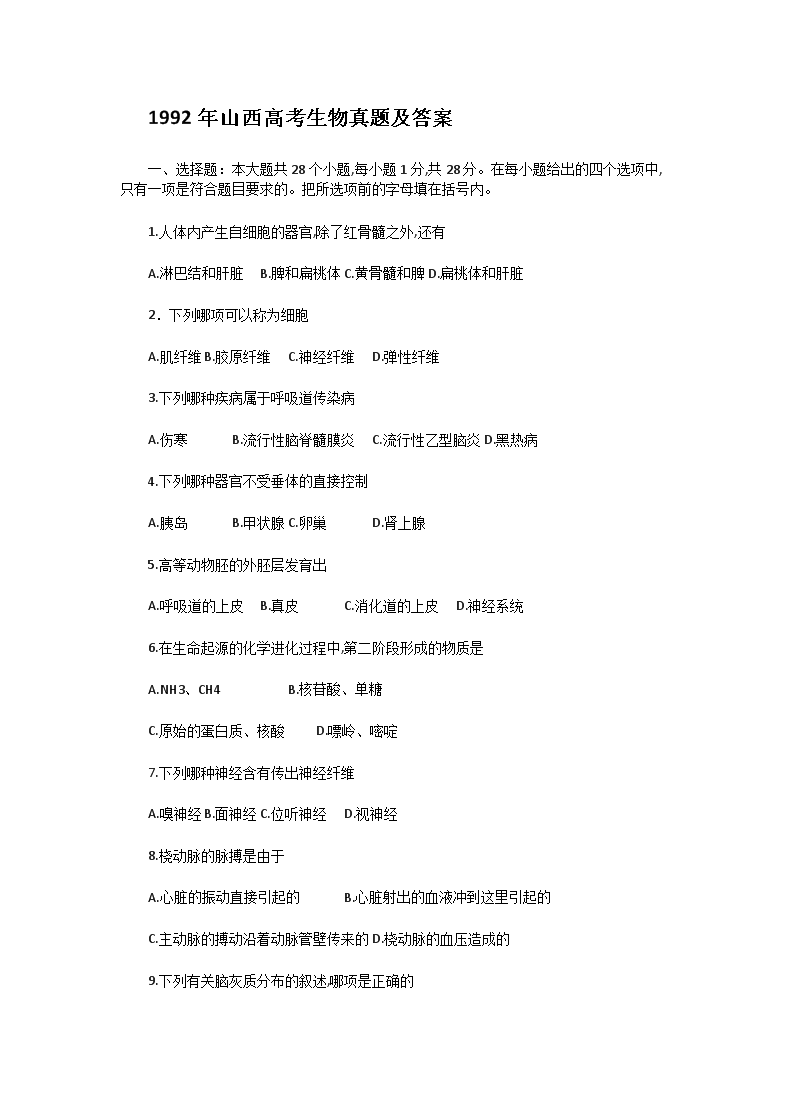 【文档名称】 1992年山西高考生物真题及答案(Word版).doc