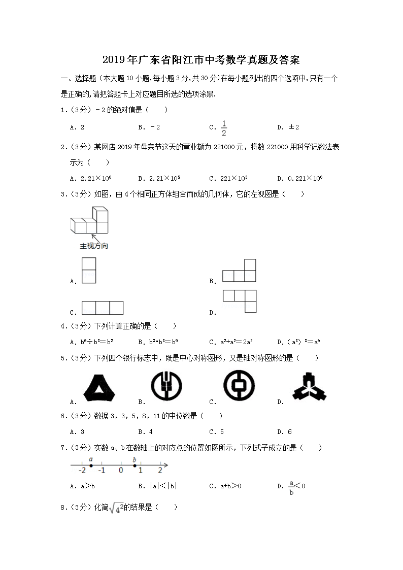 【文档名称】 2019年广东省阳江市中考数学真题及答案(Word版).doc