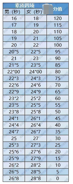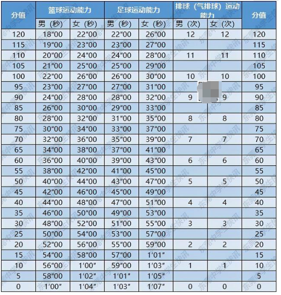 普通考生参加现场考试,体能素质考试满分为10分,考试时按一类评分标准评价赋分,实际得分直接计入考试总分;必考项目和选考项目取两科考试成绩的平均分(每个项目高分为120分),平均分超过100分的按100分计,再按“平均分×80%”计入考试总分。