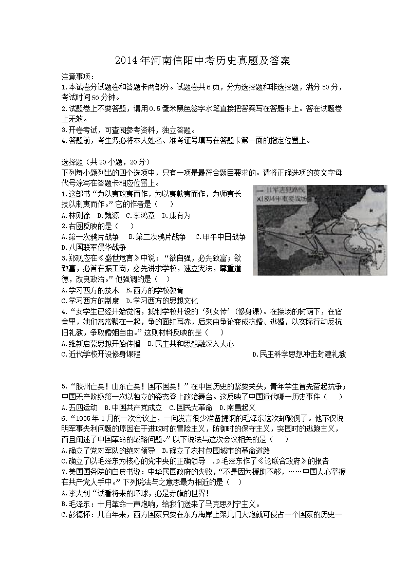 【文档名称】 2014年河南信阳中考历史真题及答案(Word版).doc