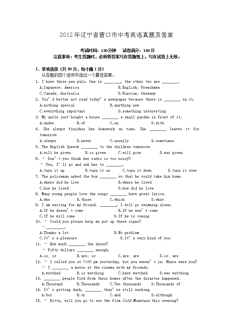 【文档名称】 2012年辽宁省营口市中考英语真题及答案(Word版).doc