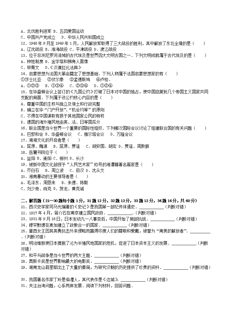 【文档名称】 2016年湖南省郴州市中考历史真题及答案(Word版).doc