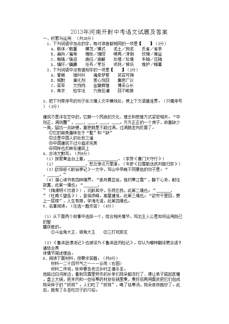 【文档名称】 2013年河南开封中考语文试题及答案(Word版).doc
