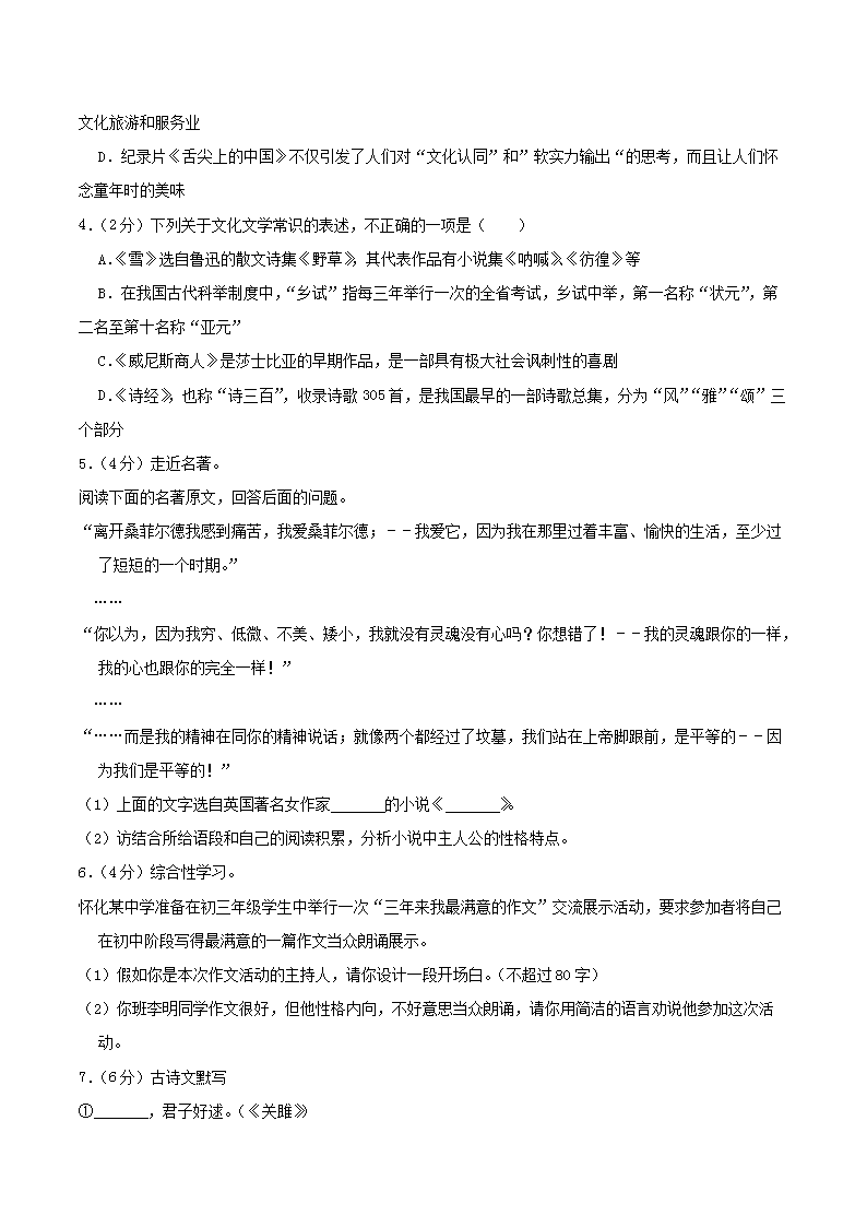 【文档名称】 2016年湖南省怀化市中考语文真题及答案(Word版).doc