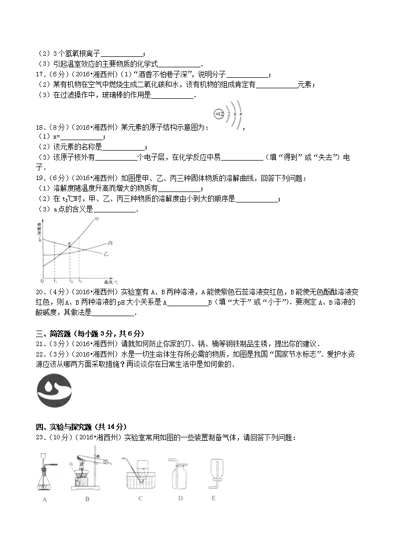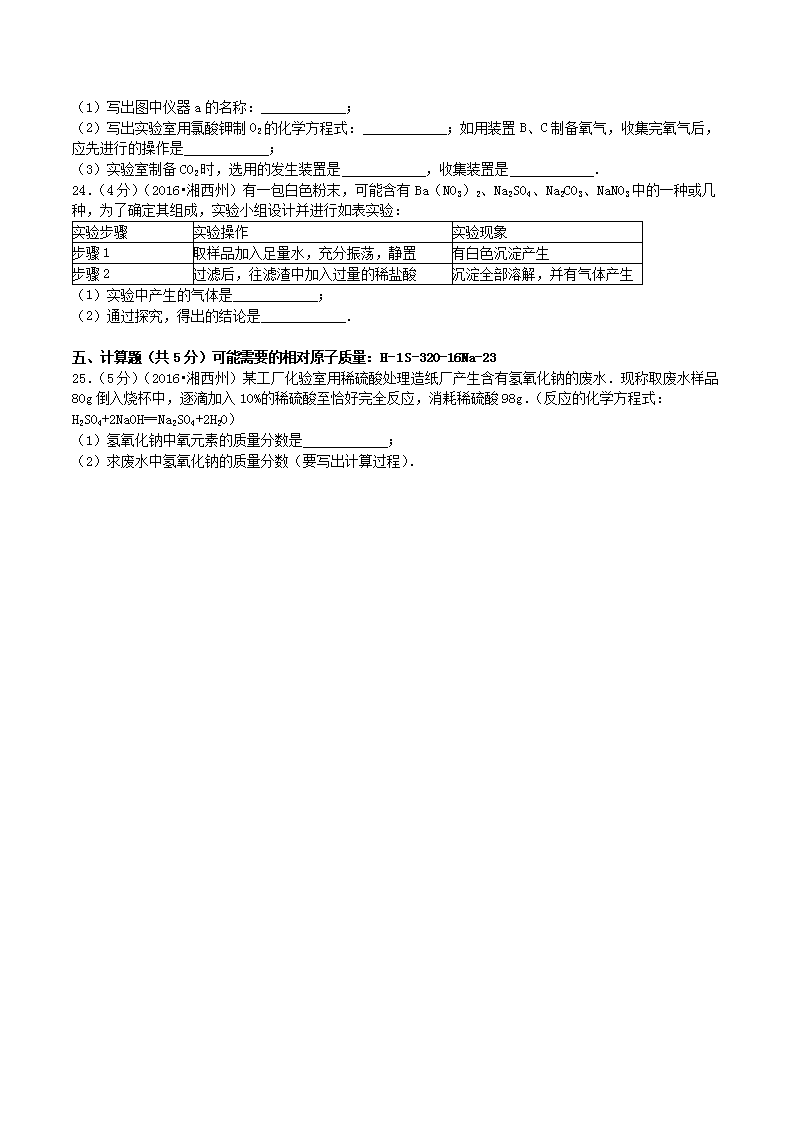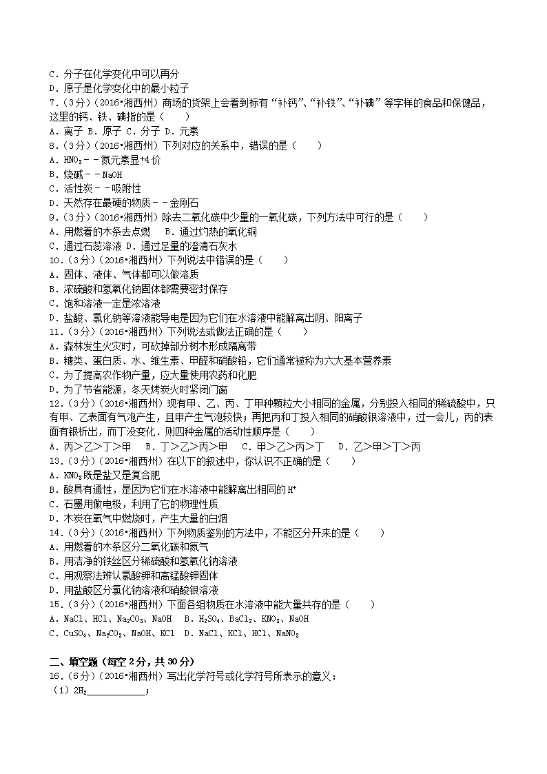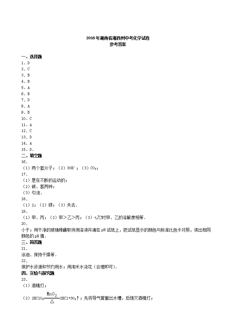 【文档名称】 2016年湖南省湘西州中考化学真题及答案(Word版).doc
