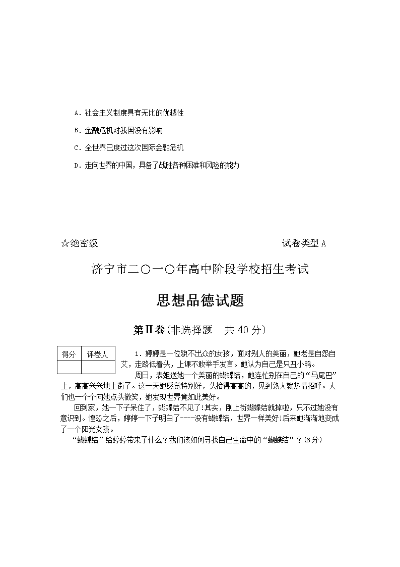 【文档预览】 无忧考网整理发布2010山东省济宁市中考思想品德真题及答案(Word版),前五页预览如下: