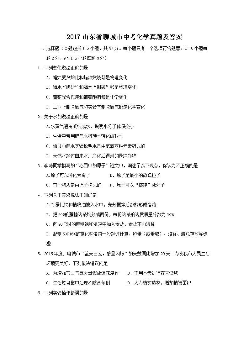 【文档预览】 无忧考网整理发布2017山东省聊城市中考化学真题及答案(Word版),前五页预览如下: