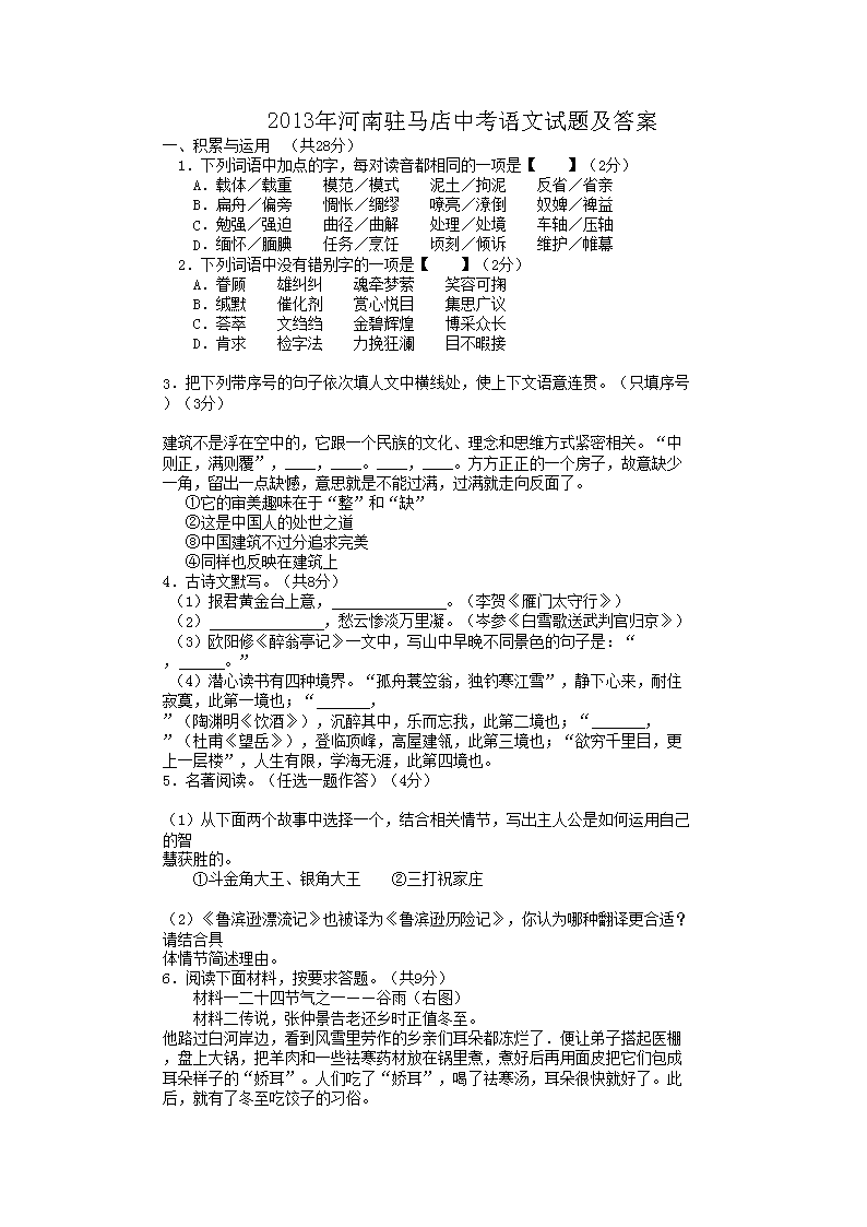 【文档名称】 2013年河南驻马店中考语文试题及答案(Word版).doc
