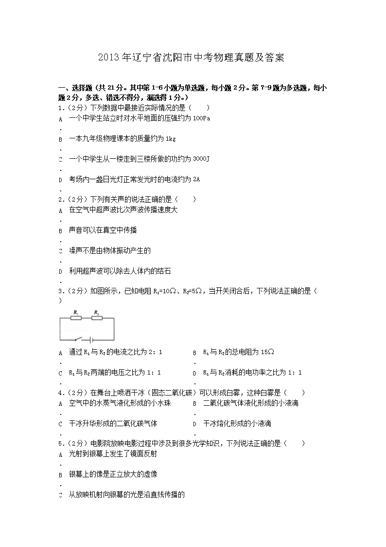 【文档名称】 2013年辽宁省沈阳市中考物理真题及答案(Word版).doc