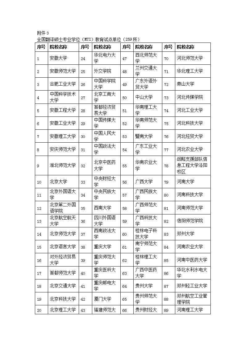 3.全国翻译硕士专业学位(MTI)教育试点单位(259所)