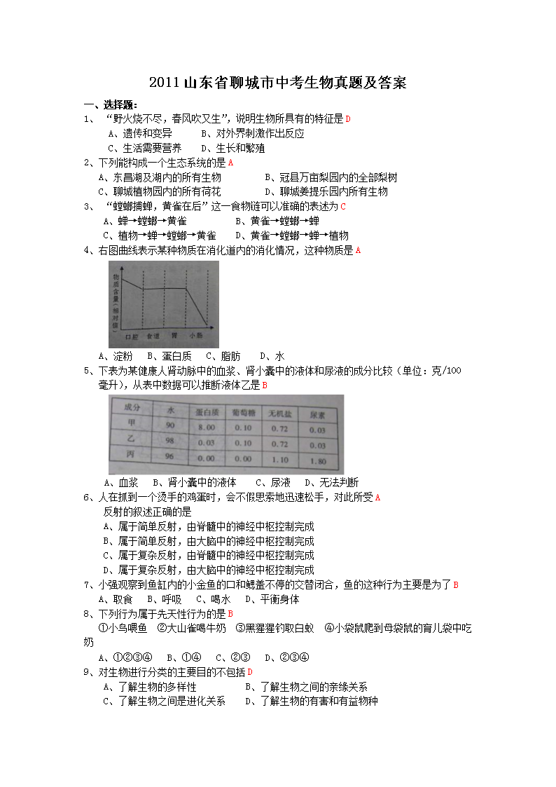 【文档名称】 2011山东省聊城市中考生物真题及答案(Word版).doc