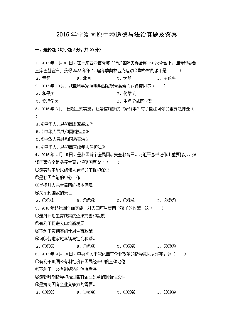 【文档名称】 2016年宁夏固原中考道德与法治真题及答案(Word版).doc