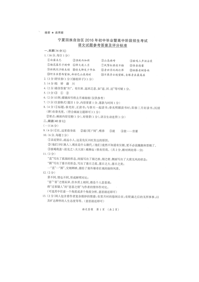 【文档名称】 2016年宁夏石嘴山中考语文真题及答案(Word版).doc