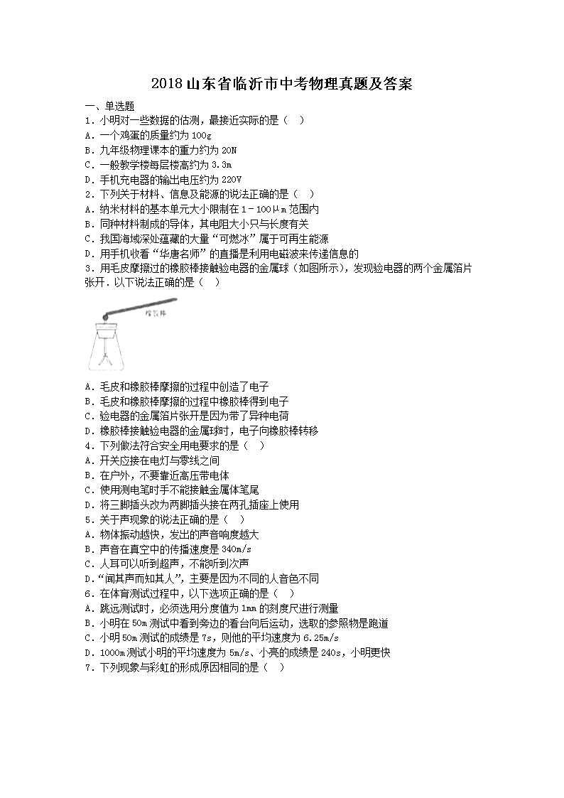 【文档预览】 无忧考网整理发布2018山东省临沂市中考物理真题及答案(Word版),前五页预览如下: