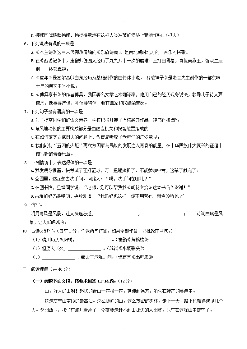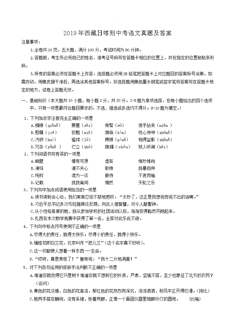 【文档名称】 2019年西藏日喀则中考语文真题及答案(Word版).doc