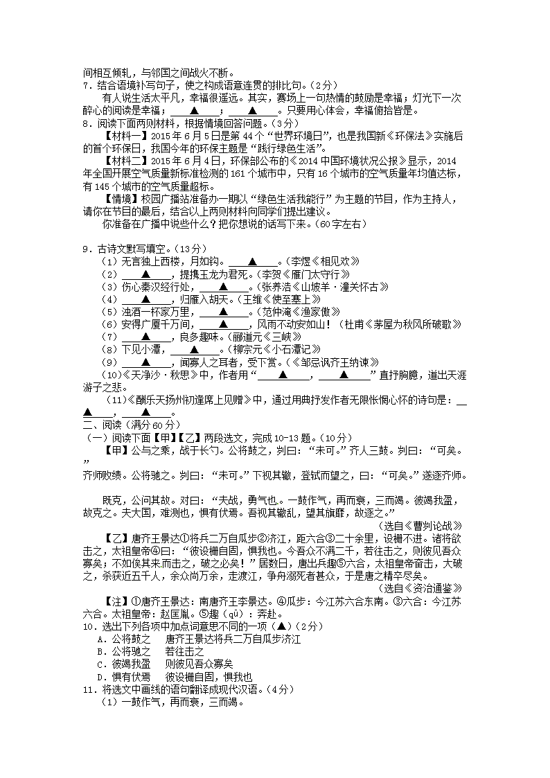 【文档名称】 2015年辽宁省葫芦岛市中考语文真题及答案(Word版).doc