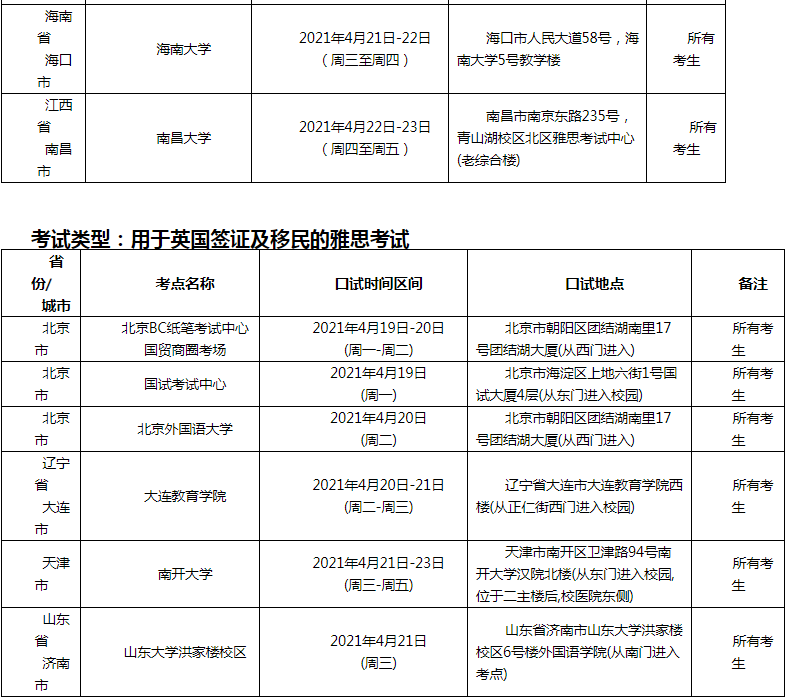 接英国文化教育协会通知,报考2021年4月24日雅思考试的考生口语安排如下,供广大考生参考。请按照报名网站公布的准考证打印时间登录雅思考试报名网站查询您的口试安排,打印准考证并以准考证信息为准。