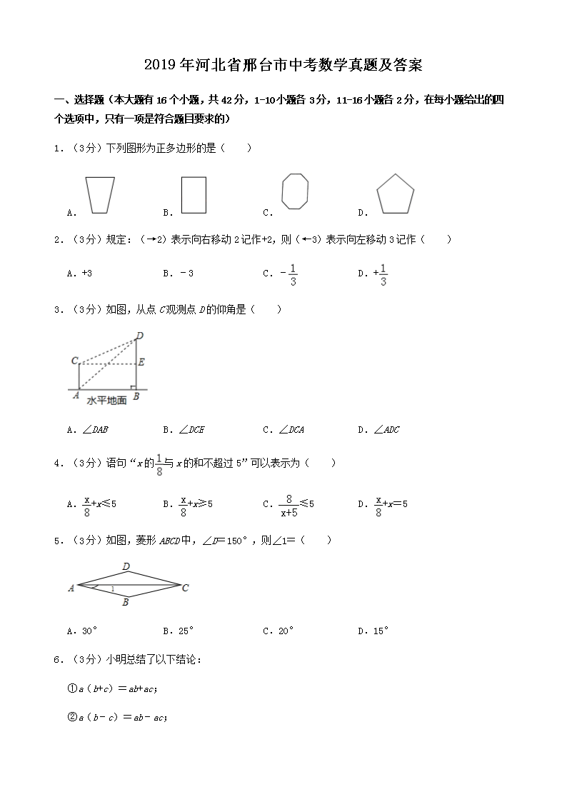【文档名称】 2019年河北省邢台市中考数学真题及答案(Word版).doc