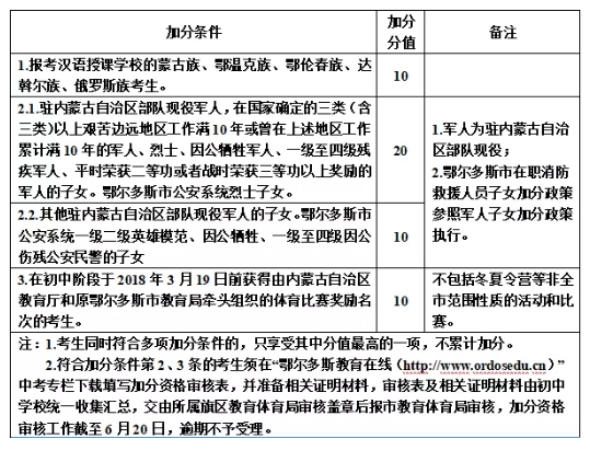 (三)根据《内蒙古自治区教育厅内蒙古军区政治工作局关于印发〈内蒙古自治区军人子女教育优待细则〉的通知》(政联〔2019〕1号)有关规定,军人子女加分范围由原来“驻鄂尔多斯市部队现役军人的子女”调整为“驻内蒙古自治区部队现役军人的子女”。
