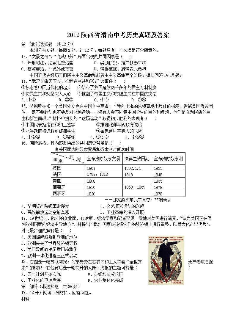 【文档名称】 2019陕西省渭南中考历史真题及答案(Word版).doc