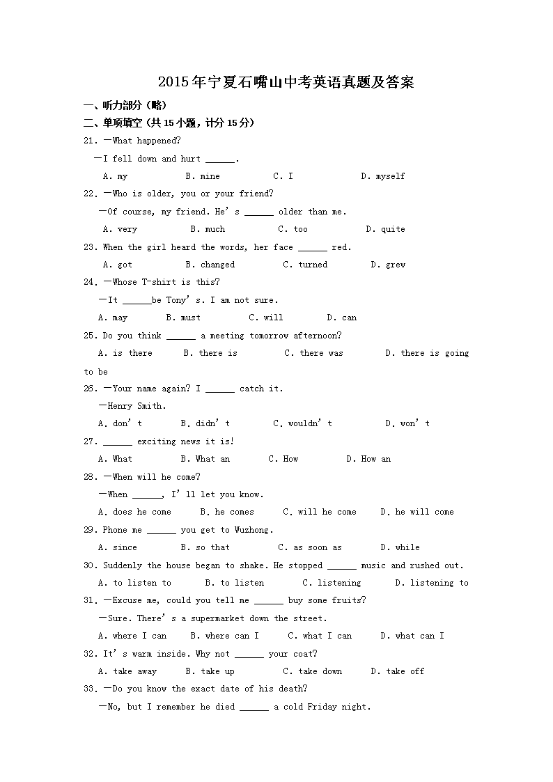 【文档名称】 2015年宁夏石嘴山中考英语真题及答案(Word版).doc