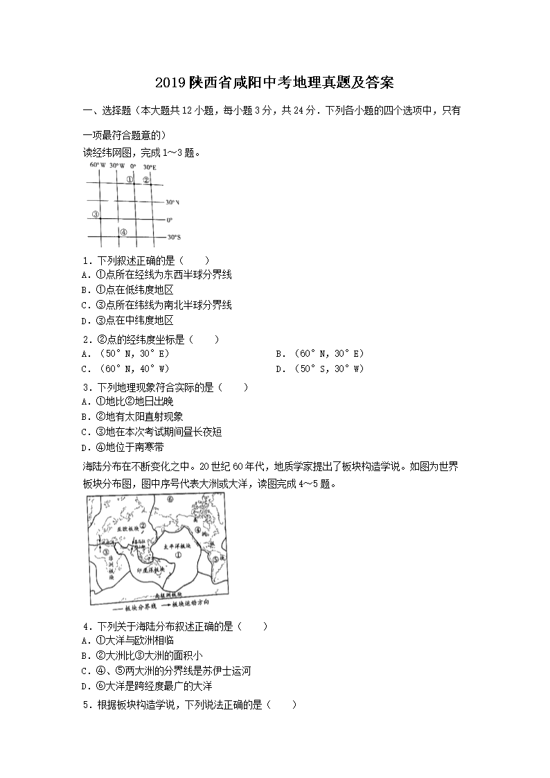 【文档预览】 无忧考网整理发布2019陕西省咸阳中考地理真题及答案(Word版),前五页预览如下: