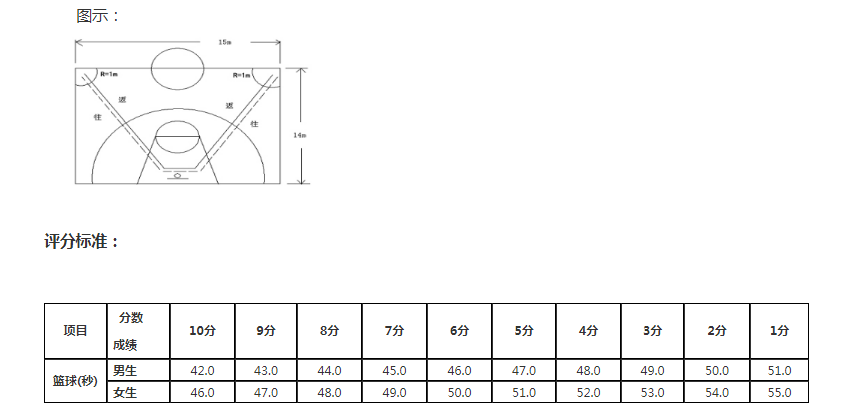测试方法:(以右手运球为例)由球场右侧边线和中线交接点(扇形区)开始运球上篮(考生起动开始计时)投中后运球至球场左侧边线和中线交接点(扇形区)后折返运球上篮,投中后运球回起点,要求:①可用任何投篮动作投篮;②投入篮后方能进行后续动作;③投篮及运球不能违例,违者不计成绩;④折返时考生也必须踏至扇形区域方能折返,运球回终点时,考生踏至扇形区内停表;⑤往返半场×2运球投篮;⑥每人考1次。登记成绩以分、秒为单位,不计小数(秒后小数非“0”时则进1原则进位)。