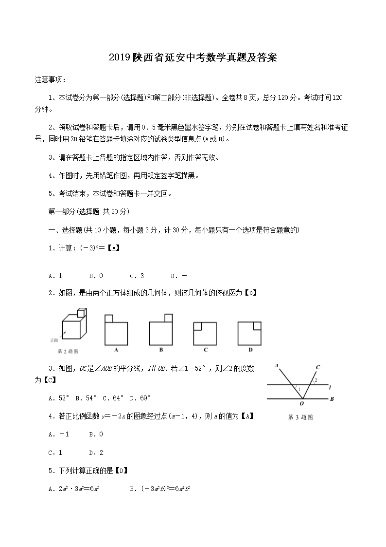 【文档名称】 2019陕西省延安中考数学真题及答案(Word版).doc