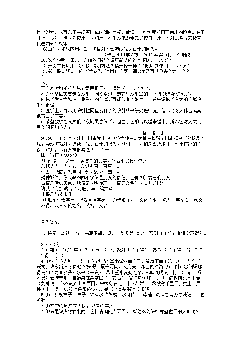 【文档预览】 无忧考网整理发布2011山东省临沂市中考语文真题及答案(Word版),前五页预览如下: