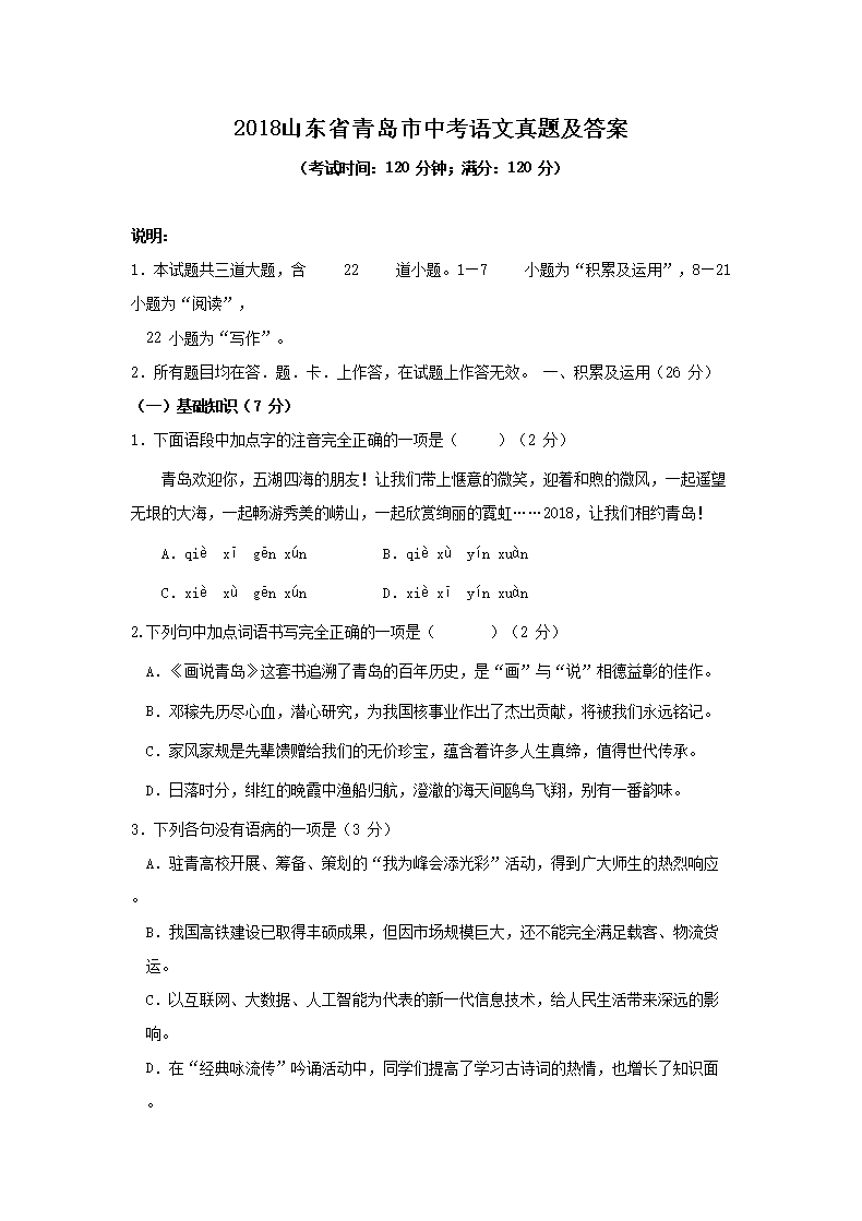 【文档名称】 2018山东省青岛市中考语文真题及答案(Word版).doc
