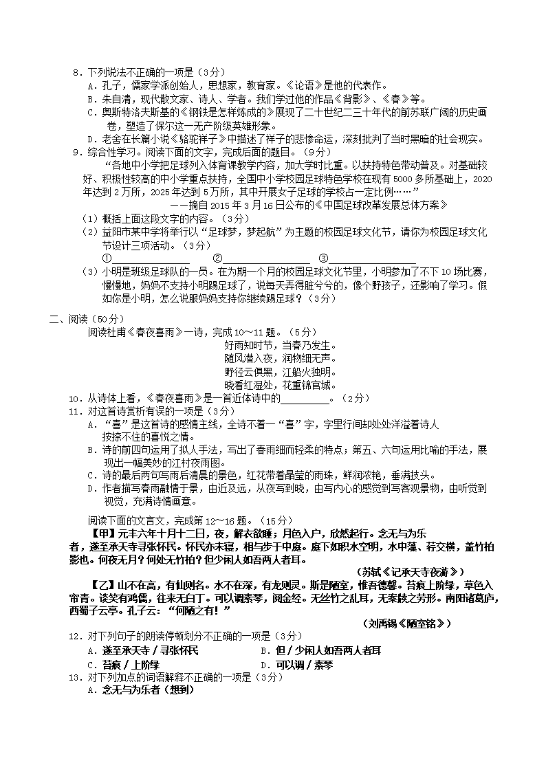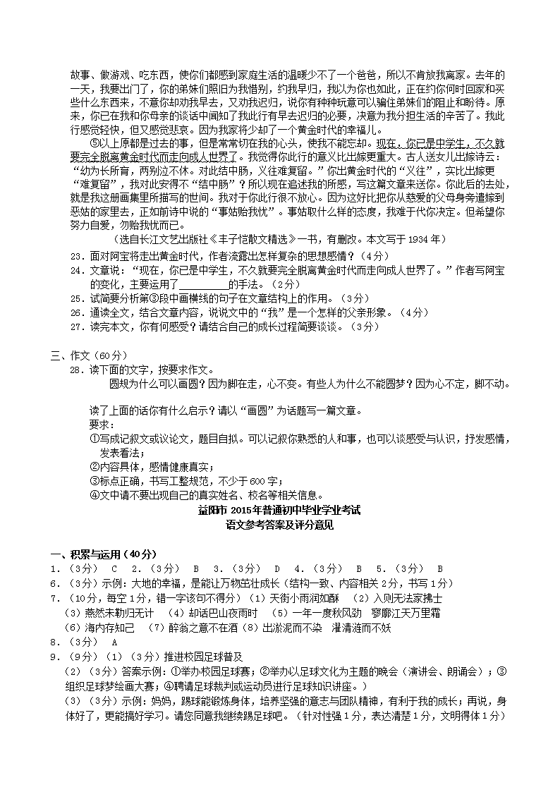 【文档名称】 2015年湖南省益阳市中考语文真题及答案(Word版).doc
