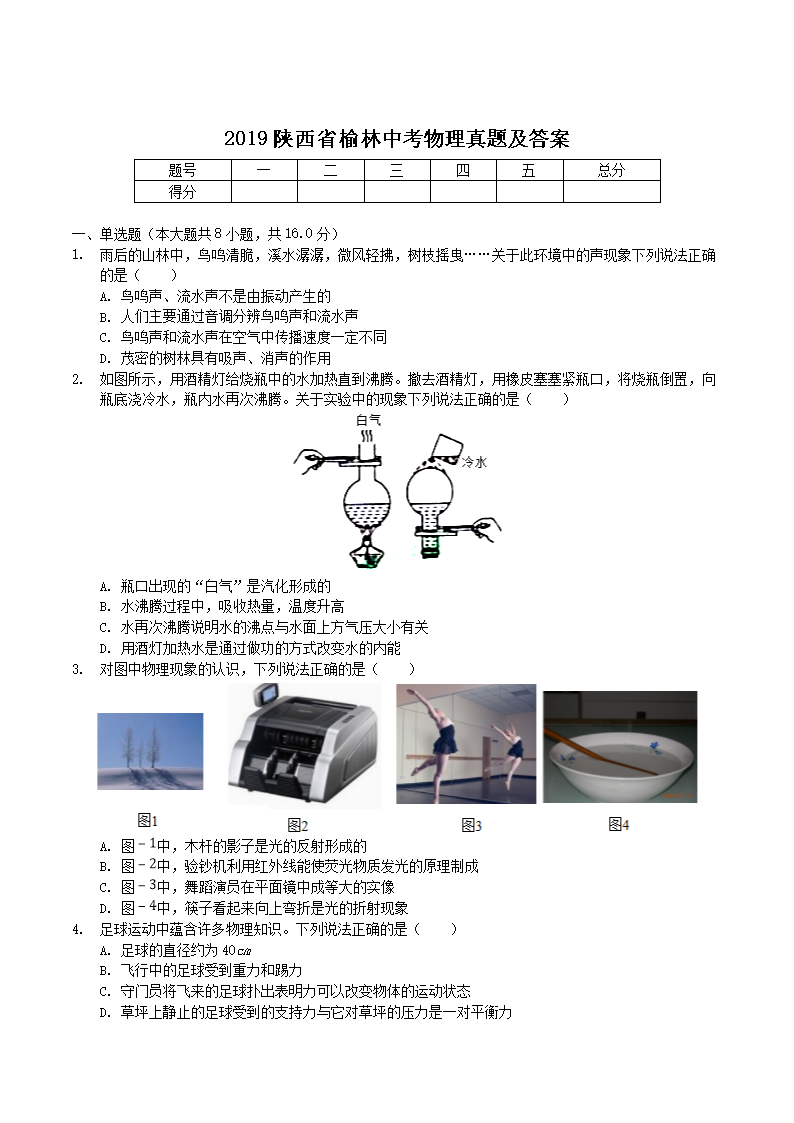 【文档名称】 2019陕西省榆林中考物理真题及答案(Word版).doc