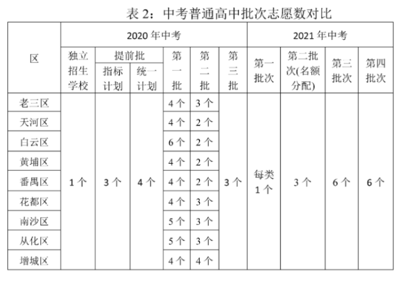 答:根据《广州市教育局印发〈关于进一步深化高中阶段学校考试招生制度改革的实施意见〉的通知》(穗教规字〔2018〕8号),我市2021-2023年高中阶段学校考试招生工作按此文件执行,其中招生录取批次由原来的7个批次调整优化为4个批次,详见表1;对志愿数也相应进行了调整,详见表2。