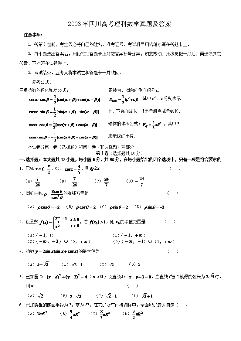 【文档名称】 2003年四川高考理科数学真题及答案(Word版).doc