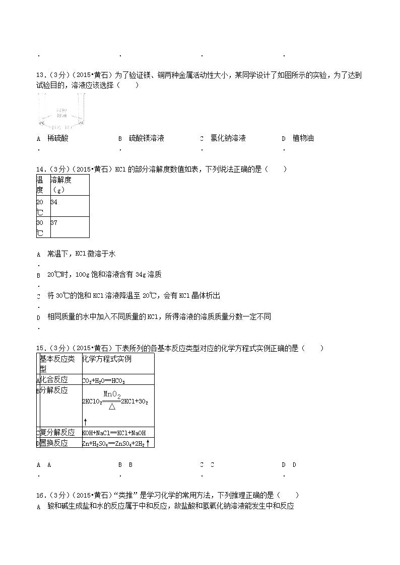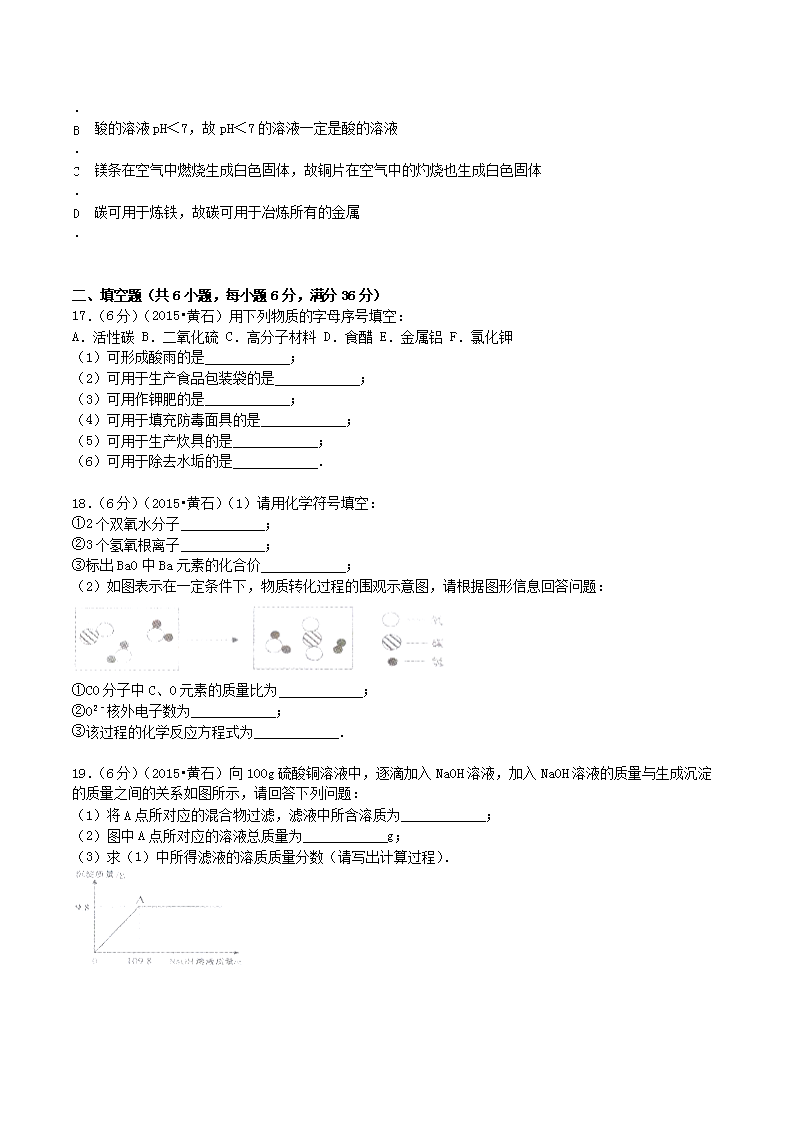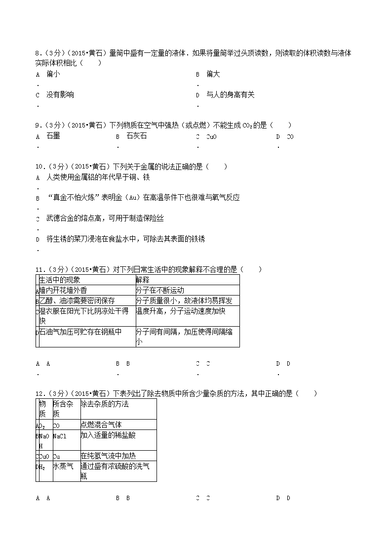【文档名称】 2015年湖北省黄石市中考化学真题及答案(Word版).doc
