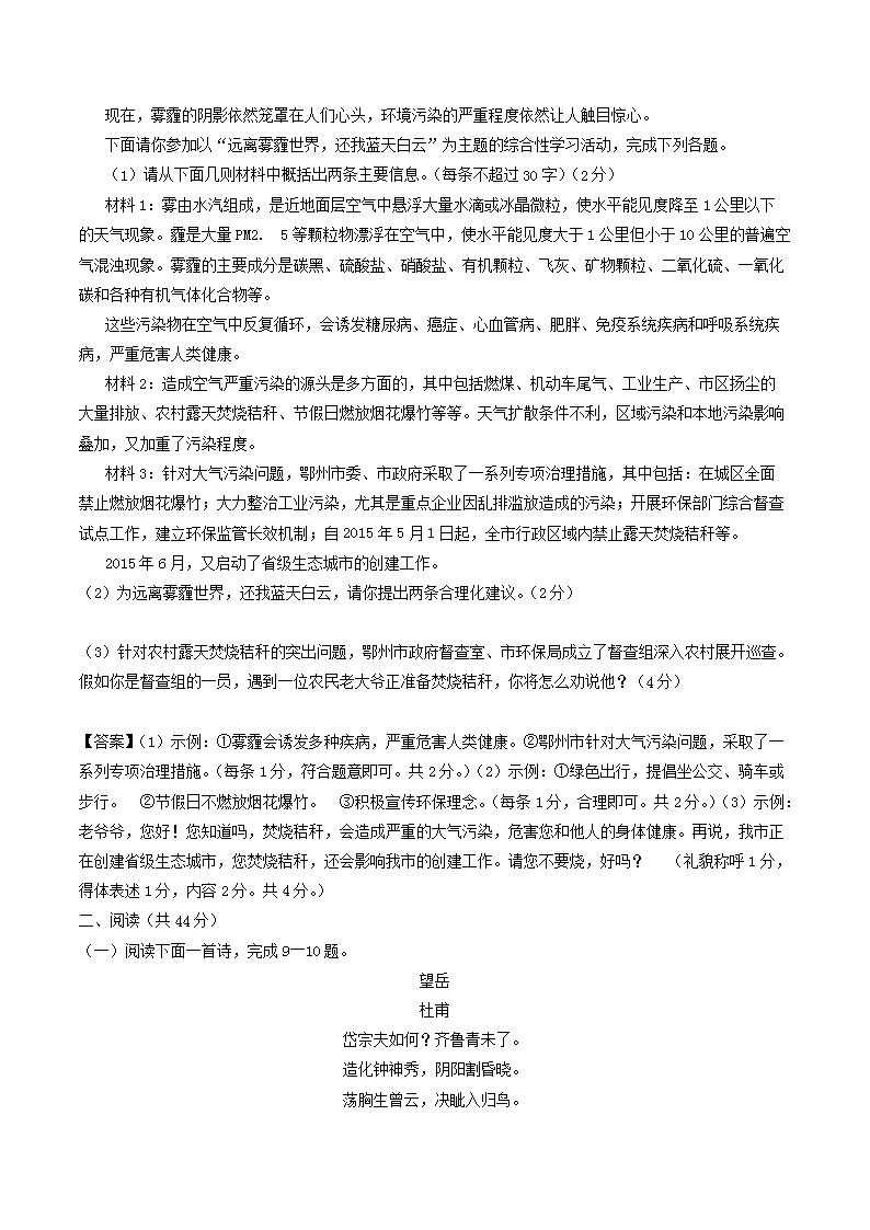 【文档名称】 2015年湖北省鄂州市中考语文真题及答案(Word版).doc
