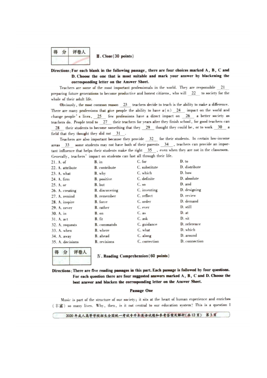 【文档预览】 无忧考网整理发布2020年河北成人高考专升本英语真题及答案(图片版),前五页预览如下: