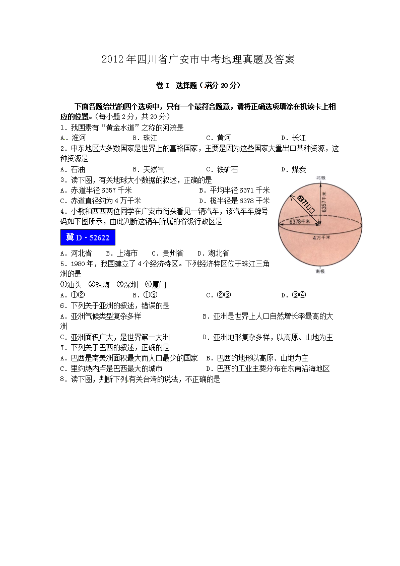 【文档预览】 无忧考网整理发布2012年四川省广安市中考地理真题及答案(Word版),前五页预览如下: